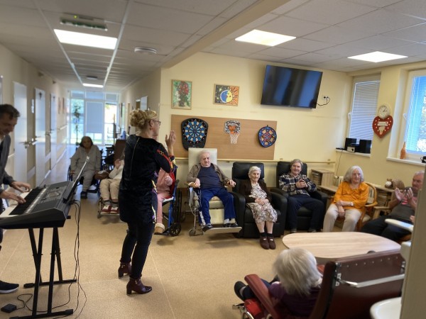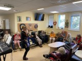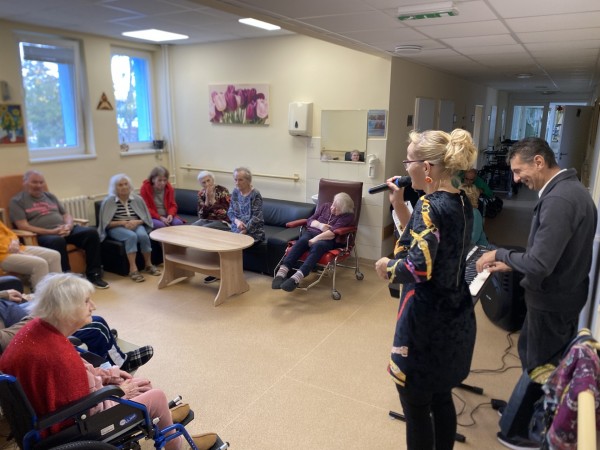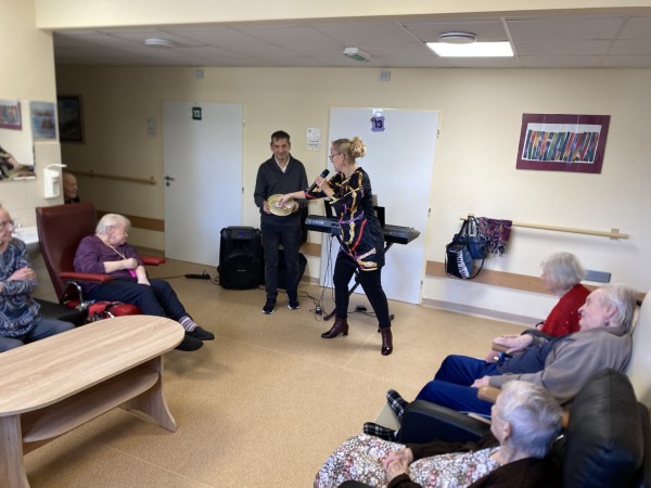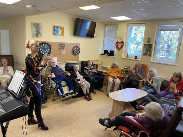 Muzikoterapia v našom zariadení naďalej pokračuje a teší sa veľkej obľube medzi klientmi. Na každé stretnutie sa veľmi tešia, hudba ich rozveseľuje, dodáva energiu a prináša dobrú náladu. Spoločne si zaspievajú známe piesne, niektorí si aj s radosťou zatancujú. Pani speváčka spolu s hudobníkom pripravujú pre klientov pestrý program plný hier, hádaniek a zábavných aktivít. Používajú aj jednoduché